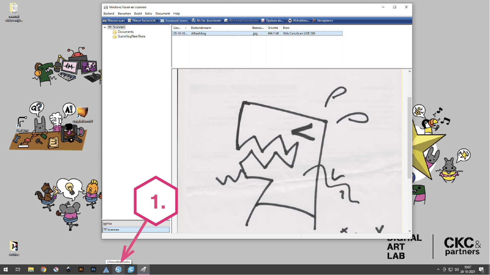Met behulp van de flatbed scanner en de software 'Silhouette' kan je een met de hand getekend plaatje inscannen en gebruiken in de vinylsnijder.